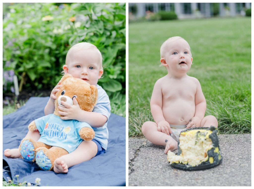River’s first-year journey was just as sweet and memorable. His maternity session took place at Everal Barn in Westerville, where his mom wore a flowing blue dress. His newborn session was at home, capturing cozy, tender moments with his parents. At six months, we did a Valentine’s Day-themed studio session full of playful props and smiles. For his first birthday, we celebrated at Inniswood Metro Park in Westerville, where he cuddled with his Build-A-Bear, enjoyed family portraits, and ended with a fun cake smash. Each session beautifully reflected the love and personality that make River truly unique.